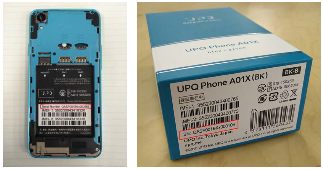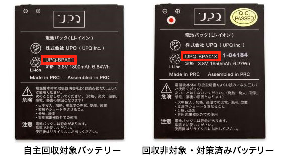 「UPQ Phone A01X」をご利用のお客様で、「UPQ Phone A01およびA01X 純正バッテリー DB01」をご購入いただいており、自主回収対象の「UPQ Phone A01X」バッテリー(型番:UPQ-BPA01)と、回収対象ではない対策済みバッテリー(型番:UPQ-BPA01X)の区別がつかない場合は、上記お客様窓口までご相談ください。